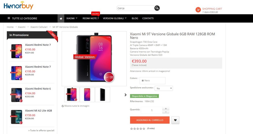 La cifra richiesta è ovviamente più elevata rispetto a quella necessaria all'acquisto del Redmi K20 (260 euro al cambio, senza tasse per il 6/128GB), ma plausibile tenuto conto delle tasse e più congrua rispetto a quelle proposte da altri store online (si veda, ad esempio GeekBuying).