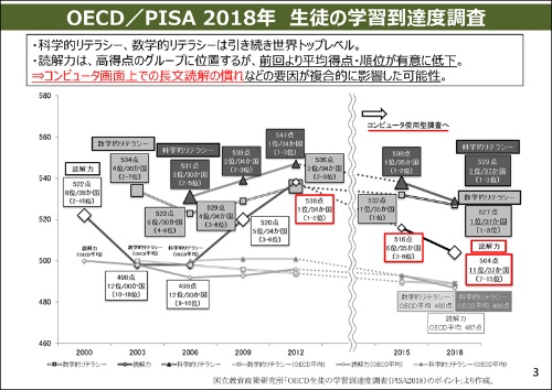 まず、OECD(経済協力開発機構)が義務教育を修了した15歳児を対象に、読解力、数学的リテラシー、科学的リテラシーの3分野について学習到達度を調査するPISA(生徒の学習到達度調査)の2018年調査で、日本の子供の読解力が参加79カ国・地域で前回の8位から15位に大きく順位を落とした。数学的リテラシー(1位)と科学的リテラシー(2位)は世界的にトップレベルを維持しているのに比べて、読解力の国際順位は大きく落ち込んだ。その原因は、2015年に導入が始まったCBT(コンピューター利用の試験)による調査手法に日本の生徒が慣れておらず、端末や画面操作がうまくできなかったことも一因だと分析している。一方、学校内でICTを利用してほかの生徒と協働作業する比率が、日本はOECD諸国の中で最低ランクであることも指摘した。